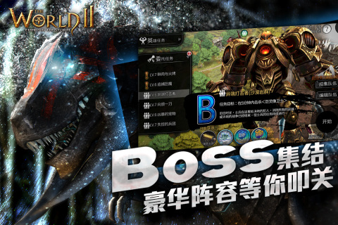 《世界2》是一款跨平台狩猎风3D动作游戏,游戏打破RPG的传统模式,摒弃繁琐的小怪和副本玩法, 让玩家一开始就与80只超巨型BOSS同场竞技。游戏拥有5种职业共30位独具个性的英雄、震撼的3D场景破坏及天气昼夜特效,联机版更配备了开放交易系统和PVE/PVP多人实时对战模式,带领玩家回归RPG游戏最纯粹的对阵乐趣。