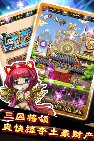 你不会是一个人在游戏,《翻滚吧三国》拥有丰富的玩家互动内容,可以比拼冲关、可以全服斗将、可以好友约战,还可以带着你的将领小伙伴们去攻打其他玩家、掠夺他们的资源。