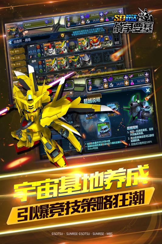 《SD敢达手机游戏》是一款以战争策略为主,集合敢达收集,交互战斗的机甲系手机网游。游戏集合了养成,收集,RPG,SLG等多种元素玩法,多个经典系列敢达机体均闪亮登场,酷炫的技能、流畅的打击感绝对让你欲罢不能。通过指尖的微妙联动,让你化身天才驾驶员,乘坐敢达书写属于自己的百年战争史。