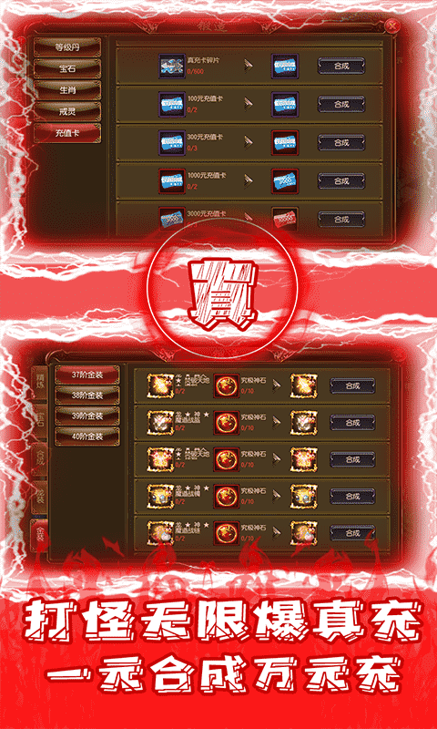 ★后缀说明:参与激战BOSS活动,击杀任意BOSS必出充值卡碎片,收集充值卡碎片后即可在“锻造-合成”功能内免费合成高档位充值卡,即可以免费从1元合成到10000元。本游戏内的充值卡就等于真充卡。