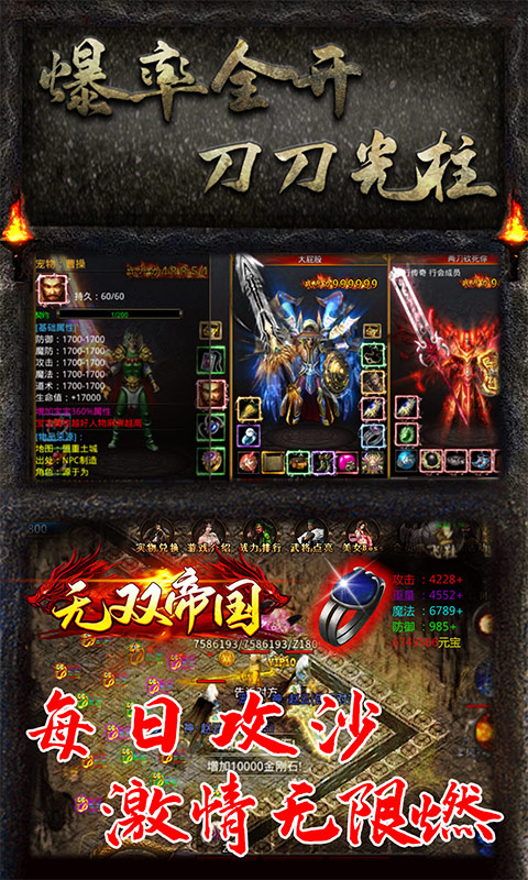 《无双帝国-冰雪超变版》是款纯正冰雪高爆福利复古传奇,携全新五大陆盛大降临!首款特权vip免费送满的冰雪传奇,所有玩家均可免费升满特权vip,免费享受所有会员服务!创角即可免费享受尊贵自动回收特权,自动经验、自动元宝、自动合成、自动回收全民直接免费开启!全地图爆率提升100倍,等级卷轴、转生材料爆率大幅提升,1-4转材料秒升,小怪爆一切,小怪爆终极!击杀任意怪均有几率直接掉落神符!最真实的复古传奇,元宝靠打、自由交易、一键回收、小怪爆一切终极等系列精彩玩法,带你回到往昔热血攻沙的纯正传奇世界!
