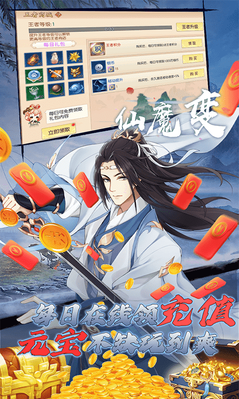 《仙魔变-送全幻武》是一款唯美仙侠题材的MMO手游!上线送玄帝(Svip1),王者商城1级,绑元88888,银币*8888888,无限送充值卡(称号)*1,充值卡礼包*1,幻武礼包*1。超高福利,超炫战斗,给你带来不一样的游戏体验。开局解锁全部幻化武器,让你成为仙侠世界最靓的崽!王者商城每日领取王者点数,免费升级王者等级,领取专属天赋点和每日礼包,让你每天点点点,战力涨涨涨,养成毫无压力!超酷炫专属职业特技,在场景的极致渲染下,让你身临其境!还在等什么,快来飞升渡劫,书写专属于你的《仙魔变》吧!