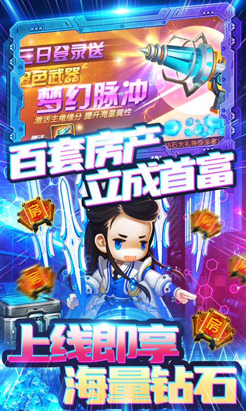 ★上线送神将乔帮主,还有顶级橙色装备箱,房产证和海量钻石哦,开局神装爽到爆!