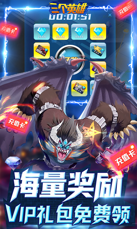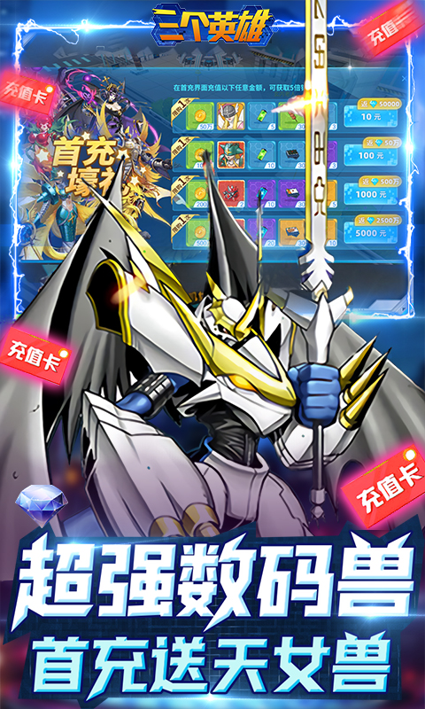 上线既送VIP10, 赠送188888钻石,100万金币,超2000元真充卡!《三个英雄-送千元真充》是基于动画片《数码宝贝》原作精心制作的手机游戏,完美重现《数码宝贝》动画剧情。游戏不仅涵盖了数码兽收集、装备养成、经典剧情过关,还有挑战玩家等经典玩法。独特的数码兽进化系统,让玩家重温儿时的进化梦想!游戏共有数百种数码兽可供选择,不同数码兽搭配出不同的特色阵容,让人爱不释手!