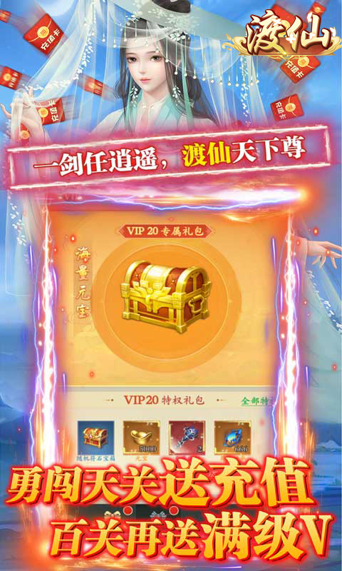 《渡仙-万充满级V》是一款以仙侠世界为题材的角色扮演游戏!上线就送VIP10,闯关再送VIP20,还有88888元宝,888万金币,10000元充值卡倾情相赠,好礼送不停!海量极品神兵、翅膀、装备,炫酷外显,助你成为九州世界最亮的崽。首充礼包豪华升级,50倍返利超值回馈。更有最高百倍投资计划,福利满满!精致的画风给玩家呈现别出一格的线下世界,丰富的养成玩法,特色多样的副本竞技,还能在游戏里与诸多好友一起创建宗门,打造最强修行势力,实力制霸谁与争锋!简单操作,畅快享受,你还在等什么?激情的渡仙征途等待你的来临!