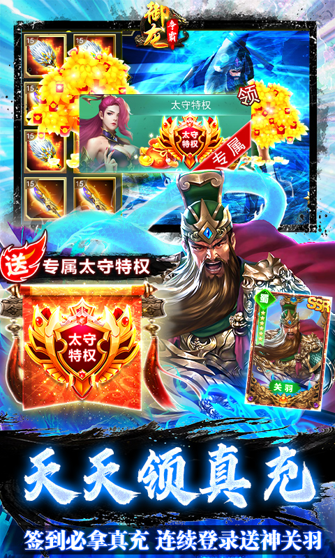 ★策划定制全新七天奖励,第二天免费领取三国无双SSR神将赵云,完成相关任务可得获得满星SSR赵云!第六天直送三国武圣SSR神将关羽!神将在手,天下我有!