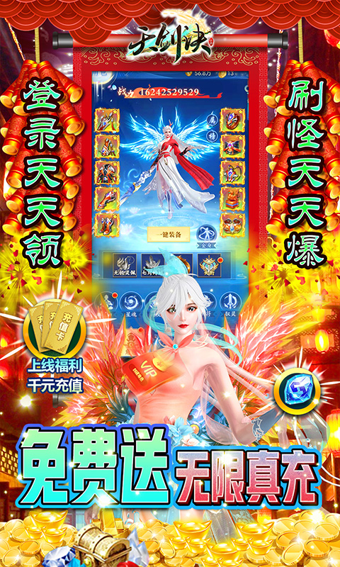 《天剑诀-共享百万充》是一款唯美仙侠挂机游戏,上线即送V10,狂送千元充值,使用7天保底V21,无限真充天天送、天天爆,全服共享充值奖励。活跃也可抵充值,白拿特权卡。游戏由资深画师团队打造,采用全新动态加载技术。创新无限制浮空玩法、御剑飞行,瞬间跨越千山万水。数百种仙法魔功、千人同屏,华丽特效呈现爆燃仙界大战。更有华丽时装、法宝、仙侣、仙宠等百变玩法,带你畅游最精彩的修仙世界。