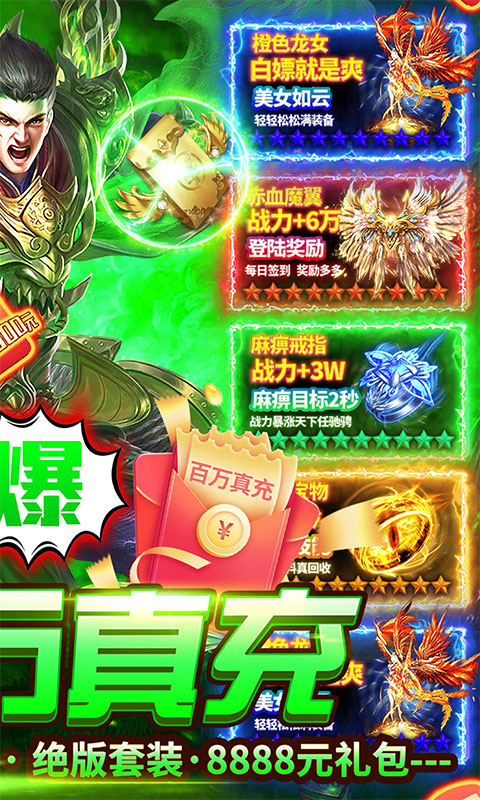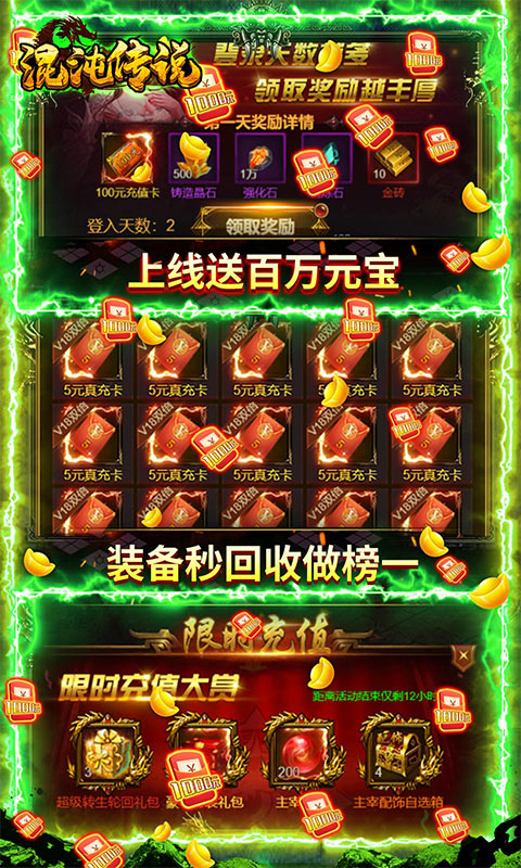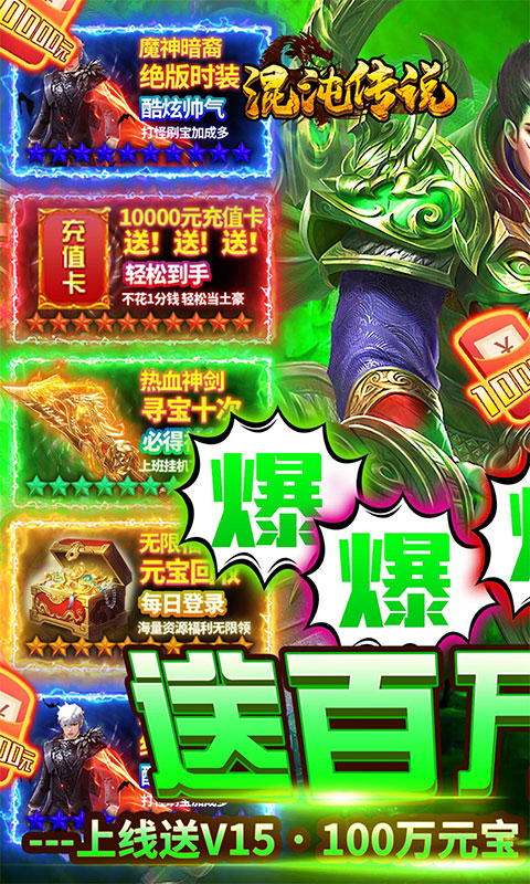 《混沌传说-送百万真充》是一款全新的传奇动作手游,打boss爆充值卡能激活每天累充和福利累计充值!开局免费送VIP15、百万元宝、金币*100000万,无限福利每日壕领不停!创角直升百级,日送百万元宝!BOSS爆率全部上调1000%,所有装备材料皆能爆!所有绝版酷炫时装免费抽,千倍返利嗨翻天!快邀请兄弟齐聚沙城,称霸全服!
