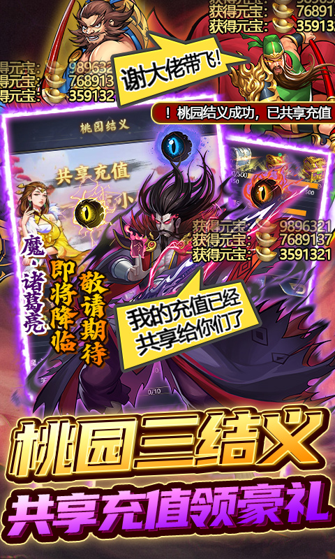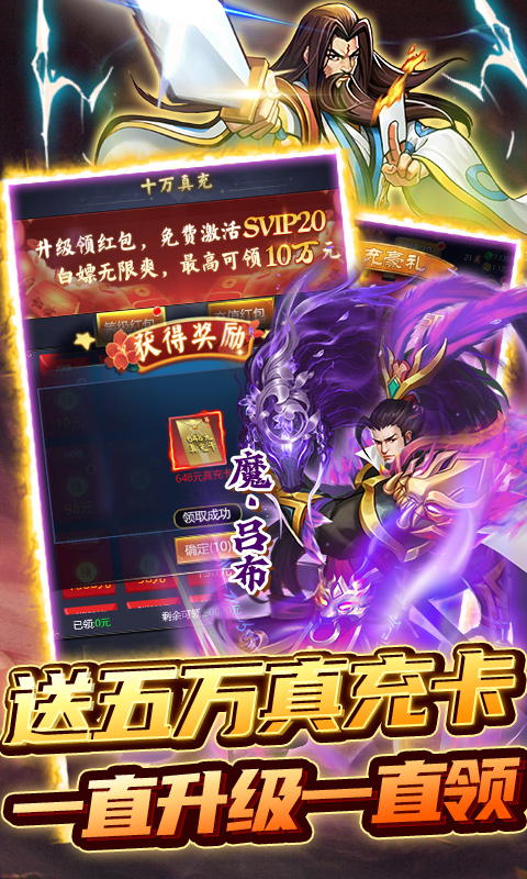 ★上线即送满级VIP20,188888元宝,1亿万铜钱,武将时装,海量道具!