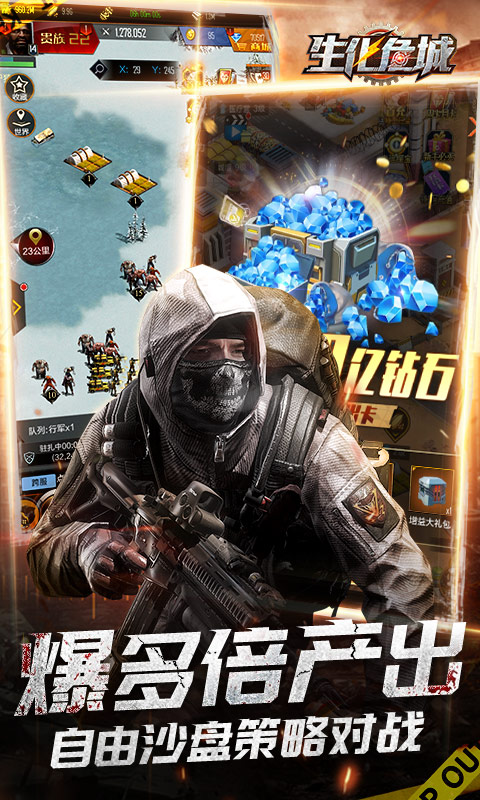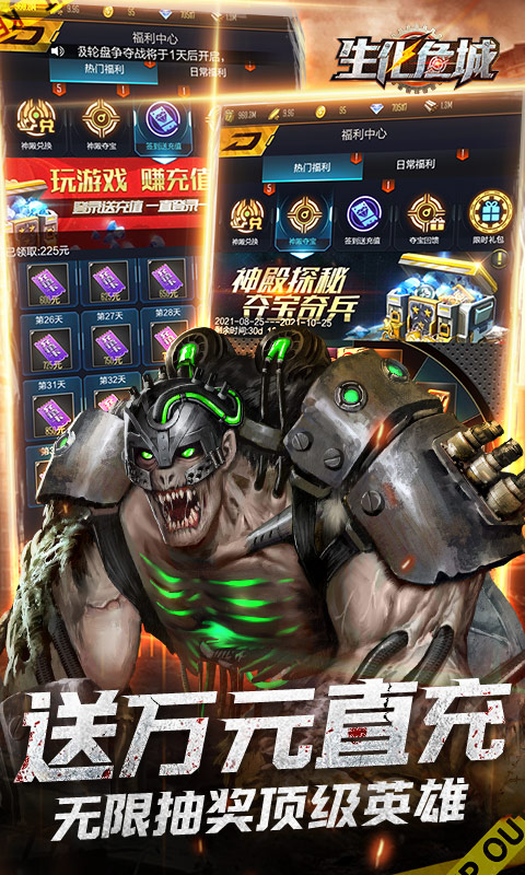 《生化危城-送万充》是一款以末日丧尸为背景的策略游戏。登陆即送vip16。登录分8亿钻石,直升vip16,领万元充值卡、资源大礼包、加速大礼包、增益大礼包!公元2020年,星外未知文明入侵,载着丧尸病毒的飞船宛如天降的死神,将不幸洒满了整个大地,一瞬间,地球顿时哀鸿遍野、满目疮痍。更有变幻莫测的末日危机,满载着机遇与危险,等待着有缘人去揭开其神秘的面纱。一些人放弃了挣扎、两眼无神地等待着死亡的降临,但是,有那么一群勇士,他们始终怀揣希望,他们拿起武器、带领幸存者们一起重建家园,集结军队抵御丧尸。