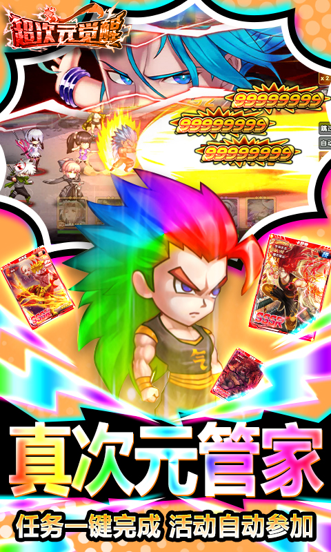 《超次元觉醒-真GM万抽UR》年度超爽激斗!一款酷炫到爆炸的动漫英雄大乱斗游戏! 游戏中拥有英雄培养、装备培养、天赋、神兽等,还有竞技场、社团战、世界Boss、组队战等社交性玩法,更有众多经典英雄任你挑选。上线就送满V,百万钻石,─键通关功能,让您快速通关告别等待,登录还送一万传说招募券,让您尽情享受抽卡的快感。不一样的游戏体验,非一般的福利,就等您来!