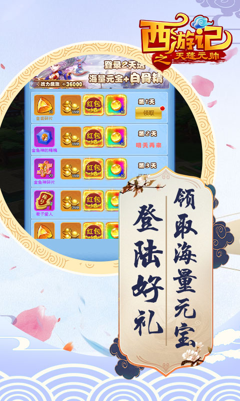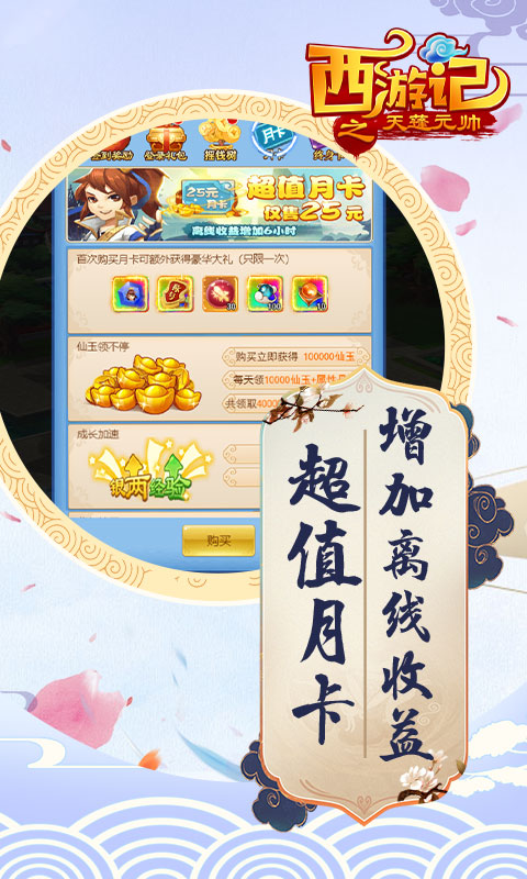★上线福利:VIP20,斗战胜佛卡*1,牛魔王卡*1,648红包*1(100级开启),元宝*100万,仙玉*8888,银两*1亿