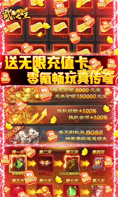 全新精品传奇手游《武器之王-送10000真充》热血归来!《武器之王-送10000真充》是款还原经典传奇大型arpg挂机类游戏。上线vip15,直送10000真充卡(激活每日累充),全新版本玩法GM商店上线,任何道具低价无限购买!每日登录免费再送真充卡,无限领取!副本通关大量爆充值卡,走到哪爆到哪!零氪玩家的真爱传奇!
