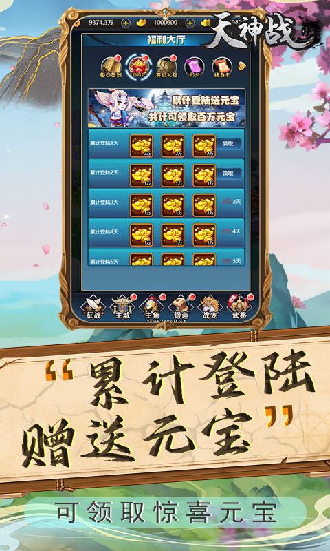★累计登陆送充值卡、神装碎片、高阶武将等超值高阶道具