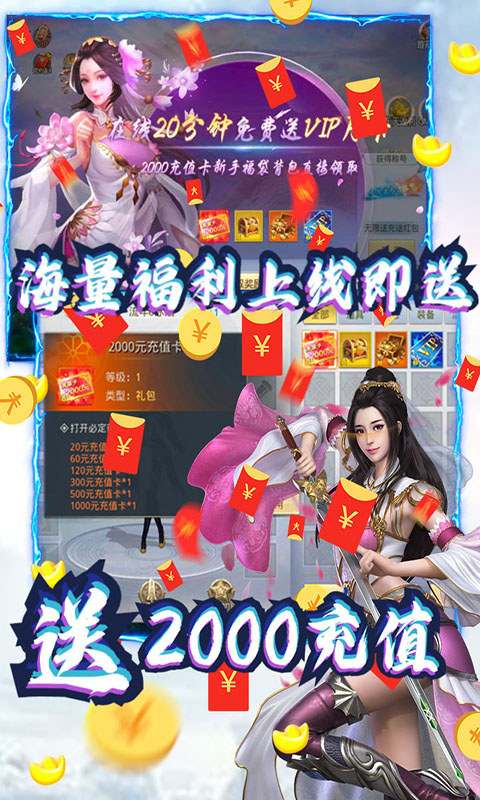 ★上线送VIP12、神充值卡及海量元宝,在线即送充值卡,元宝送不断。
