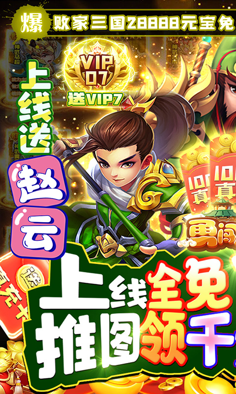★上线福利:上线即送VIP7+极品武将,领28888元宝,每日送百元真充