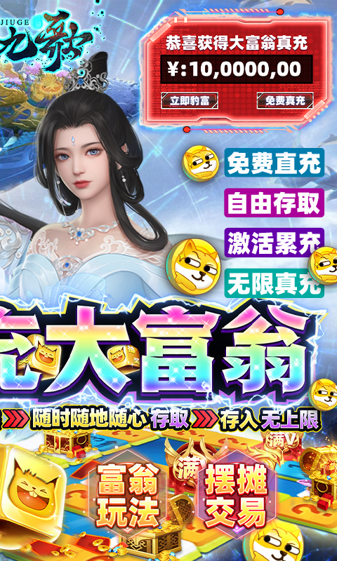 ★创角即送满级VIP,88W8888元宝,3千万银两、千元真充红包和称号-大富翁赚真充。