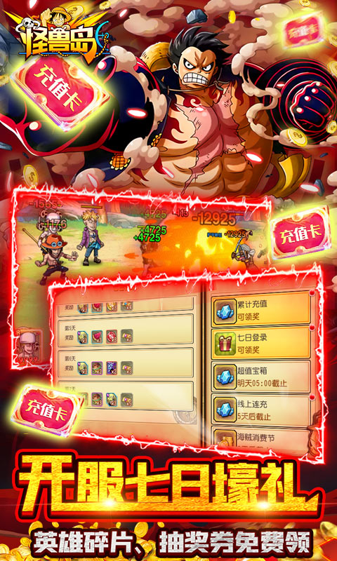《怪兽岛-天天领充值》上线既送VIP9, 赠送88888钻石,200万金币,588体力!航路不止,燃梦不熄!日漫经典大航海题材手游来袭!游戏精致还原动画经典剧情,知名角色悉数登场,100%原味再现草帽海盗团成长路上的点点滴滴。游戏人物设计全面贴合原作设定,用心打磨场景、动作细节刻画,无损还原粉丝心目中的大海盗时代。游戏核心玩法独树一帜。游戏互动玩法丰富,轻松结识冒险路上的可靠伙伴,一起踏上成为海盗王的伟大航路吧!