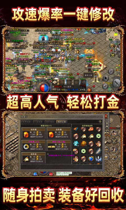 《热血王座-加速辅助器》是一款主打“以怀念2002年左右网游玩法”MMORPG手游。沿用端游《传奇》的登陆页面、最大程度重现经典,主要玩法以“升级、爆装、攻沙”为核心,实现了“不卖装备、不卖元宝、自由交易、一键回收”真实传奇精彩玩法,喜欢复古传奇风的兄弟绝对不容错过!