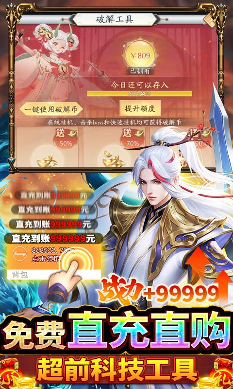 ★别的仙侠游戏养成角色要充钱,我们送破解工具,野外挂机可刷出大量破解币,破解币可替代RMB到指定充值界面进行充值或购买礼包,使用后可激活累充活动!
