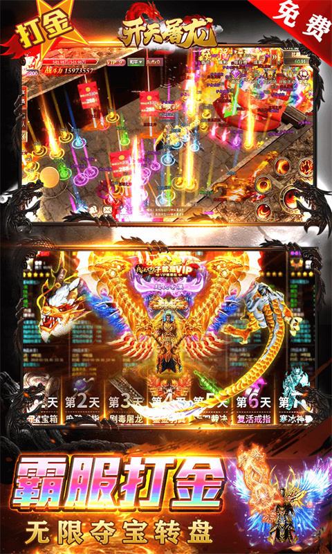 ★霸服打金:上线满V,打金夺宝转盘无限转,每日无限获取充值卡和神兵宝箱,免费奖励大量珍惜的百分比属性丹