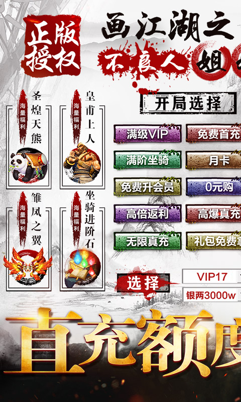 ★上线福利:上线送VIP17直升卡、8.8w元宝、银两3000w、属性道具包*20