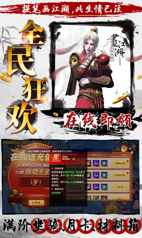 ★在线福利:在线送满阶坐骑,且在线20分钟即送月卡,寻宝转盘每日抽奖,大量材料等你拿