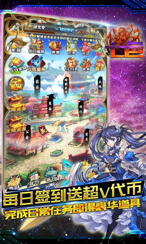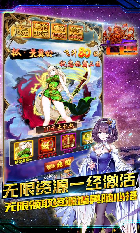 《七色-无限真充》一款以娘化三国为主旋律的创新型卡牌游戏,玩家在游戏内组建属于自己的队伍,带领队伍共同对抗黑暗势力,玩家通过努力登顶巅峰,五虎上将,三国美女尽收麾下,随意搭配,上线福利多多,赠送至尊特权,千万元宝,千万金币,登录即送价值千元真充卡,全新基金活动,一经激活,每日领取豪礼,还在等什么呢?和我一起称霸三国吧!