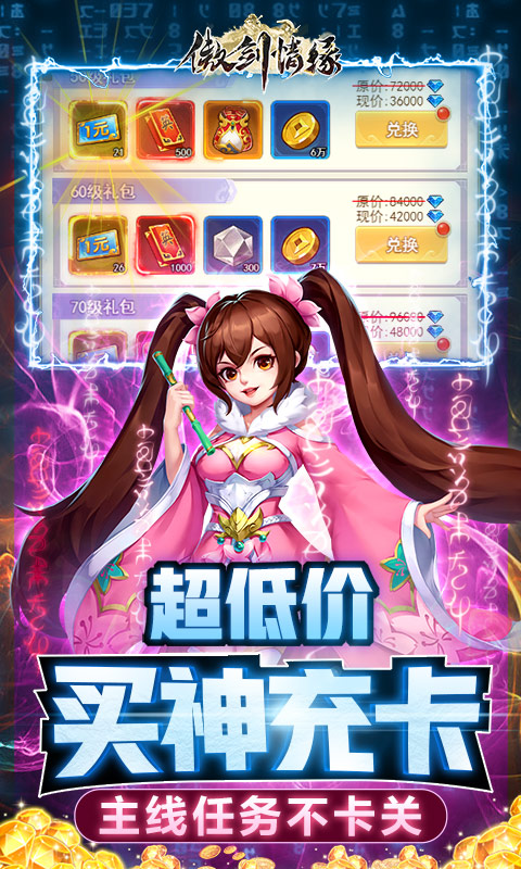《傲剑情缘-1钻送红卡》纷纷江湖路,萧萧仙侠情。有人的地方就有江湖。我辈人才倍出,在江湖上呈现出了新的一场百家争鸣、八仙过海各显神通的精彩竞争。《傲剑情缘-1钻送红卡》是一款全新的以仙侠题材背景的RPG游戏。精美的人物刻画、丰富真实的江湖场景、热血刺激的打斗渲染,给你身临其境的直观游戏感受。天纵英才群侠出,铁血豪情论英雄。这里有上百个极具特色、风格迥异的武侠等待你的召唤,与你一起结伴而行,共闯天涯路。