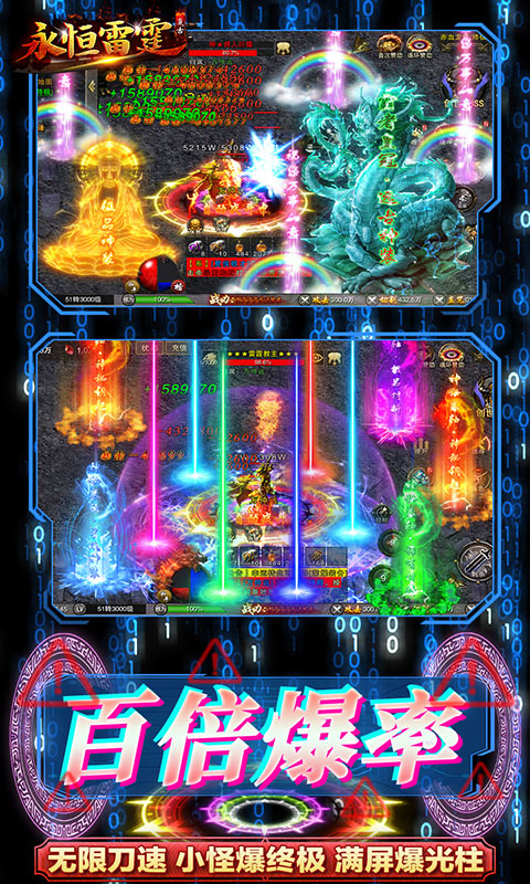 《永恒雷霆-魂环攻速版》上线送钻石20万,元宝1亿,战狂★魂环特权,创号免费领取,炫酷魂环外观。主线一点秒升百级,一款独创1秒99刀,无限攻速,百倍爆率,所有装备,所有特殊装备以及材料游戏内全部能爆。主线送复活神器【鸿蒙·重生】,享受死亡原地复活。极品吸血武器,刀刀暴击,刀刀吸血。特色狂暴系统,刀刀切割,满屏爆光柱。装备全靠打,小怪爆终极