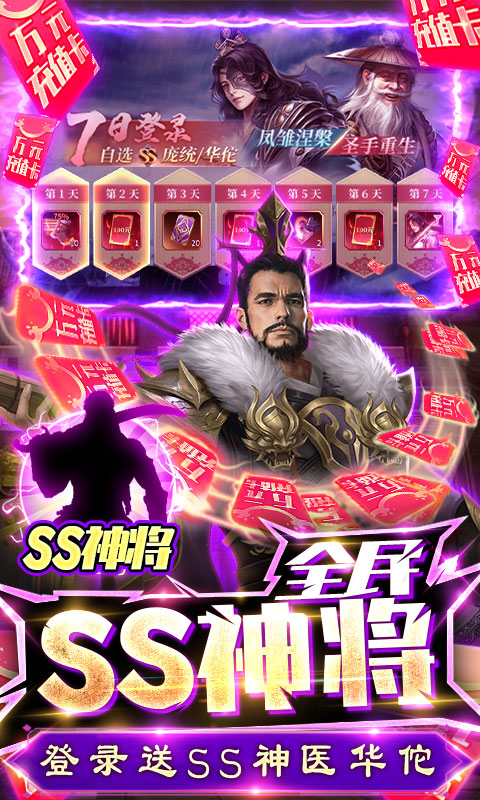 ★赛季任务,七天登录可以免费获得SS武将。开服秘宝,赛季商店,累充活动,VIP礼包可获得大量SS神将碎片。