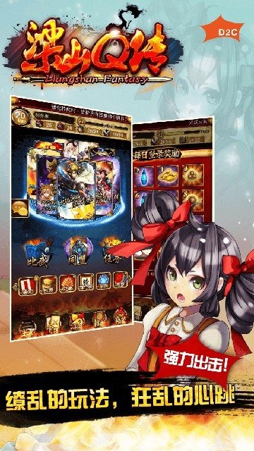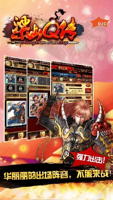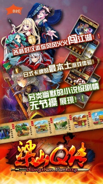 《梁山Q传》是一款集换式卡牌手机游戏。在《水浒传》的大背景下,用全新的标题党叙事方式、水墨卷轴动画配置,将这个古老的江湖文化走出了新戏说style。 游戏在尊重历史的前提下,在游戏剧情中带入了时事话题,融入了网络热词和新鲜话题,带给玩家耳目一新的感受。 游戏以卡牌的获取和强化为最终需求,卡牌有攻击、防御、战力需求和技能四大属性,通过喂卡的方式进行强化,强化成功后攻防属性100%提升,战力需求不变,技能属性为有几率的提升;强化需要消耗银两。 与普通卡牌手游只能出战一组卡牌的情况不同,《梁山Q传》中设置了“攻击组”、“防御组”以及”辅助组“的概念。其中,”攻击组“和”防御组“类似于美式橄榄球中的攻防两套阵容,为玩家营造了一个能够发挥主观能动性空间,以次来实现阵容的最优化配置,最终实现击败对手的目标。”辅助组“的出现,充分的体现了人性化的游戏设置。放在辅助组的卡牌不仅会提供攻击及防御加成和一定几率的技能加成,更为人称赞的是其不受任何战力限制,可谓是真正的辅助法宝。