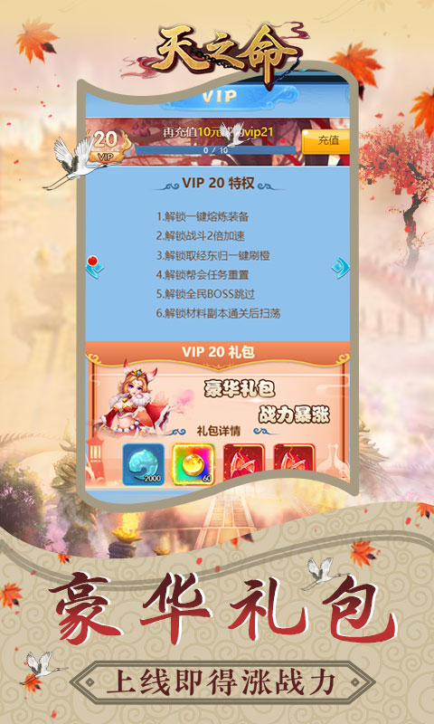 ★上线福利:VIP20,海量元宝*10,1000000仙玉,1亿银元(通过邮件领取)