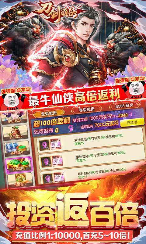 ★【充值高返】:首充5~10倍返还;投资计划分别可获得超100倍、超150倍、超200倍的收益,收益包含有实充、仙玉、神玉;更有神玉投资,领取高达16倍神玉!