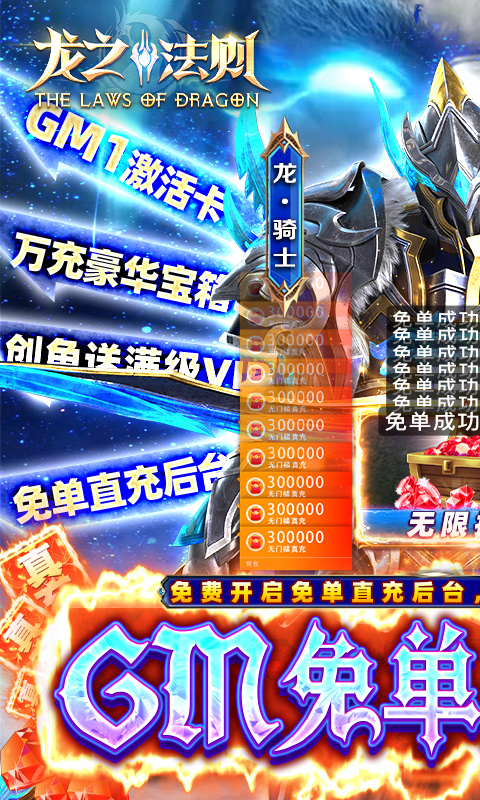 ★创角送满级VIP、GM1激活卡、万充豪华宝箱(内含10000元真充卡*1)、转盘抽奖券*100、1元免单券*100(获得自动存入免单后台余额)