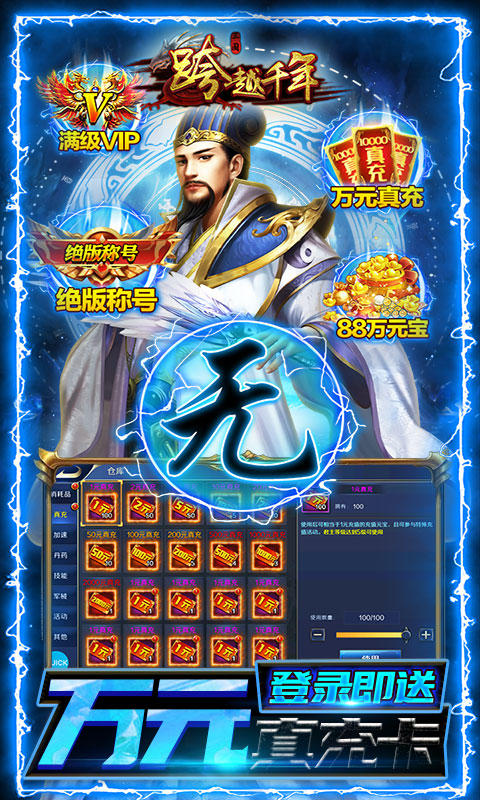 重回三国,全新GM版本《跨越千年-GM折扣金券》震撼来袭,上线送满V,开局即领万元充值卡,88万元宝,绝版称号等海量福利,此外还有无限资源、GM商城等全新功能,游戏中真充哪哪都送!除此之外,游戏特有的SLG策略模式,结合三国武将养成玩法,过五关斩六将,攻城略地,助主公一统三国!