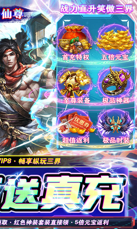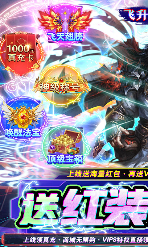 ★后缀说明:送神装真充:创建角色后就可以领取VIP1-8的奖励,可以获得红装碎片