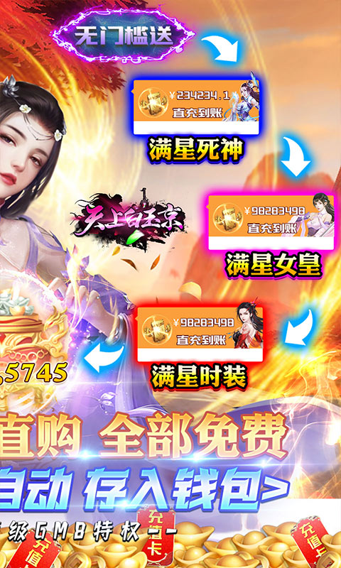 《天上白玉京-GM直购全免》开局送直购币*8888,至尊称号,超值礼包,GM装备全部免费破解,钱包余额可直接兑换直购币!登录壕礼送满星时装-聊斋妖仙/满星灵宠-毁灭死神/满星伙伴-血翼女皇!98送直升250级经验丹,送50倍真充,极致体验战力飙升3000万!开局送20阶坐骑羽翼礼包,送SVIP10,月卡激活卡,神兽-神·天狼星,元宝*888888,铜钱1亿!全地图自由飞行,跨越千山万水,千人同屏,暴燃仙界大战,华丽百变时装,伙伴灵宠等百变玩法,畅游最精彩的仙侠世界。