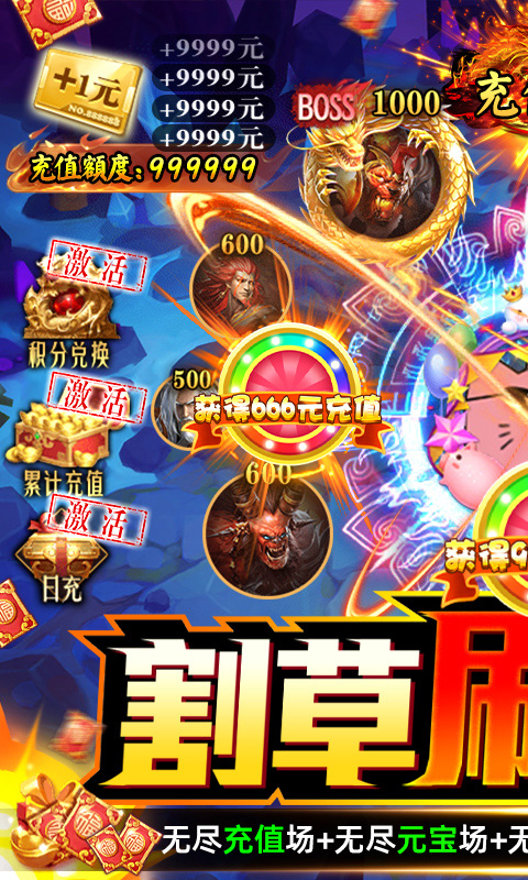 ★上线割草获取充值额度即可获得免费充值,免费充值可激活大量活动,战力即刻飞升,免费充值的元宝可以将GM商城全部解锁!