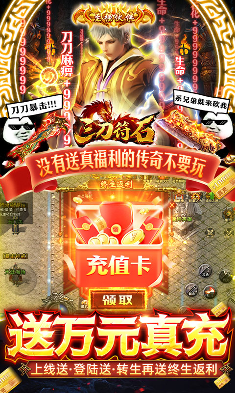 ★【版本福利】:开局无限刀,刀刀切割爆神装,上线送VIP10直升卡,送万元真充、黄金屠龙、绝版称号、材料大礼包