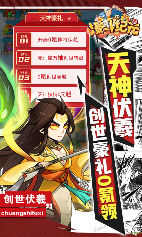 ★后缀说明:上线立即领取创世神券解锁创世神将·伏羲,和超多创世道具,进游戏10分钟免费解锁创世转盘1W抽,更可0氪超多创世特权,解锁创世商城