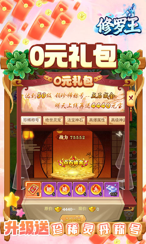 《修罗王(GM神宠无限充)》是一款原汁原味的仙侠类游戏! 还原纯正修仙体验,上线即送海量福利!各种玩法,多种宝物宠物陪着你一起战斗!群仙竞技场,仙道会,王者争霸等等,让你重拾竞技的快乐!斩妖除魔,亲身经历筑基期攀升至玄仙的过程,一路弱小到强大,圆你一个修仙梦!