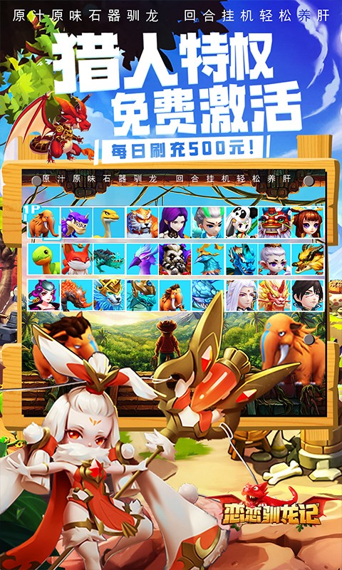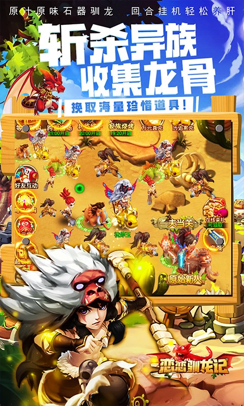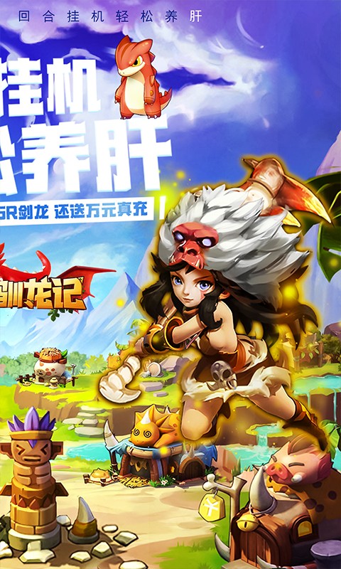 《恋恋驯龙记(送SSR万充)》最原汁原味的石器战斗游戏,最多样化的宠物系统,最养肝的挂机体验,就是这款恋恋驯龙记!原始时期,凶兽出没,需要勇士带领守护村落,创立家族,组建站队,打造属于你的石器帝国!!!福利度空前,不仅开局送SSR剑龙,登录还送万元真充。福利远不止如此,化身屠龙猎人进入埋骨之地,每日屠龙,每日获取大量货币!!!超多活动玩法、跨服战斗、休闲聊天、日常养成一网打尽,自动战斗解放双手,就是轻松就是玩!