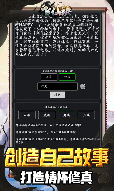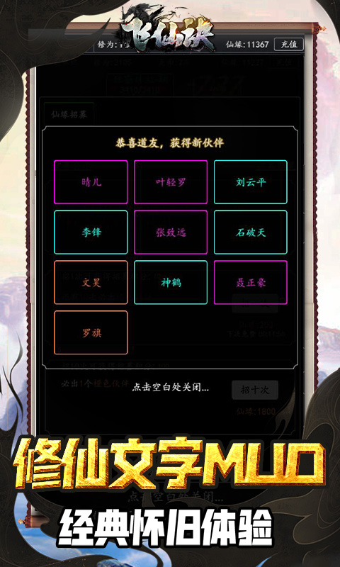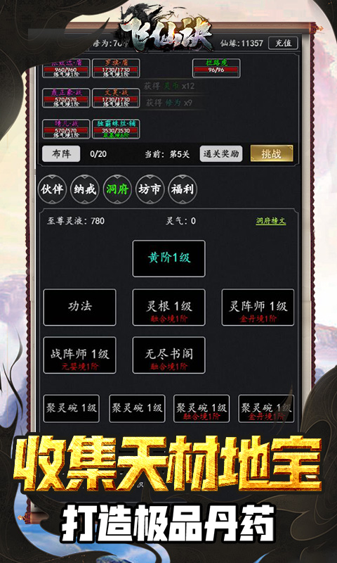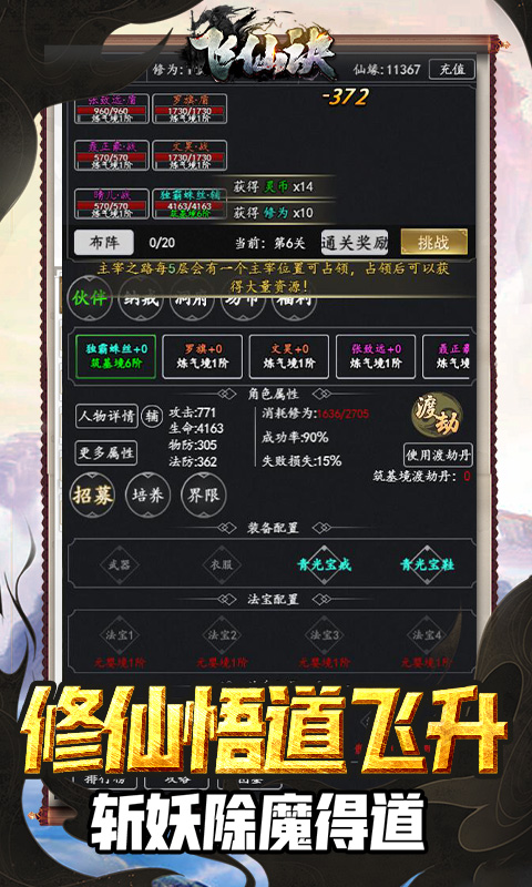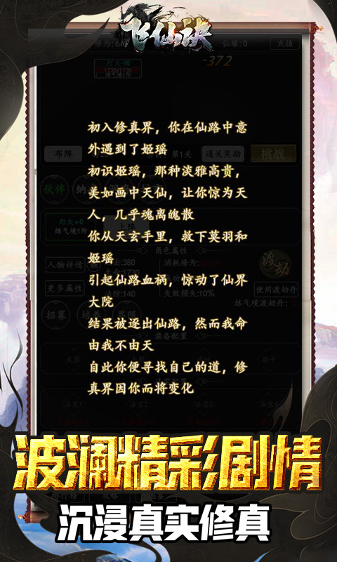 《飞仙诀H5-文字修真》是一款以东方玄幻为背景,轻松又有策略的文字放置类修真游戏。游戏中主角将从21世纪穿越至“修真世界”踏上斩妖除魔的修真之路,在修真之路上可以招募不同职业的伙伴,并提升他们的修为境界,组建属于自己的修真队伍,利用伙伴职业克制、伙伴技能搭配等策略设定,来尝试多种伙伴阵容去挑战各种各样的关卡和副本。游戏完美还原一个奇异的修真世界,在浩瀚星空,无尽苍穹,大千位面斩妖除魔,炼丹炼器,构建千万修真小说迷的“修真梦”。