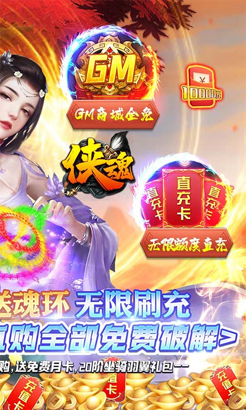 《侠魂(魂环科技刷充)》开局福利免费送十年魂环,魂环BOSS无限刷真充!!开局送点充特权,免费无限648元点到手软!!开局送直购币*8888,百年魂环/至尊称号,超值礼包,GM装备全部免费破解,钱包余额可直接兑换直购币!“直升260”58元送直升260级经验丹,送100倍真充,直购币*5000,传奇属性丹·三阶*15000!全地图自由飞行,跨越千山万水,千人同屏,暴燃仙界大战,华丽百变时装,伙伴灵宠等百变玩法,畅游最精彩的仙侠世界。