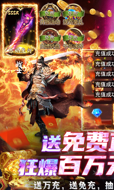 《诸世王者(爆魂环百万真充)》开局送GM1,千元魂环,百万元宝,千万绑金,千元真充。0元免GM,百万真充大礼,全民无限免费送,超爆超爽三职业修正平衡版本,爆率大提升享无限打金打BOSS无敌爽,小怪BOSS均掉落真充与终极装备魂环,0氪也能爽玩一整年,PK打宝战沙城,热血豪杰闯天下,真·福利、真·传奇手游!