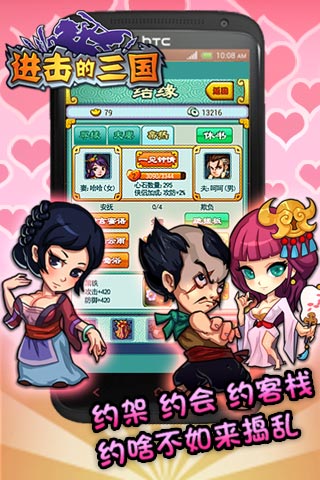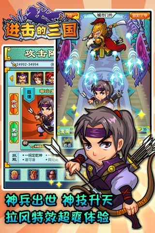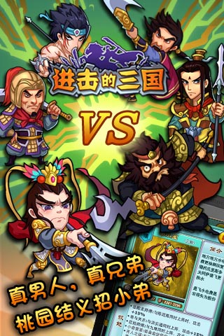 《进击的三国》是一款Q版三国类卡牌手机网游,首创了真金循环领取系统,突破了送礼券礼包的束缚,让玩家更自由的体验游戏真实的乐趣。制作《剑侠系列》 《刀剑2》等游戏配乐的知名游戏音乐制作团队“晓音音乐”参与并制作了游戏背景音乐,让玩家享受到视听的盛宴。 不仅如此游戏丰富的内容,搞笑的剧情,无所不能的穿越系统和卡牌组合给了玩家不一样的体验,还通过三国为题材,以驰骋沙场,收获武将,赤炼兵器,广交情缘为核心主线,让玩家通过剧情闯关、比武对抗以及情缘交友,来获得武将,增强阵容,最终有情人终成眷属一起笑傲三国,获得无上成就感。 《进击的三国》1.1.0版本震撼更新