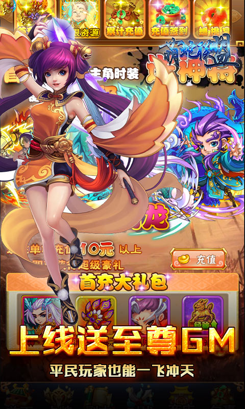 ★上线送至尊GM,海量元宝与银币,登录就送千元真充卡与新手代币礼包。