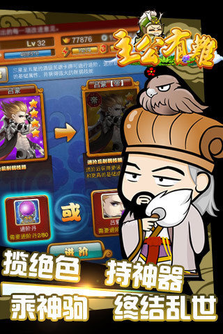 《主公有难》是一款以三国乱世群雄逐鹿为背景的卡牌手游,玩家在游戏中通过闲游三国乱世,经历各种剧情和战斗考验,不断获取名将神兵,强化自身实力从而称霸三国一统天下。经典的三国剧情,不一样的卡牌玩法。不仅名将如云,还有绝色美人相伴,唯有主公方才有此待遇!