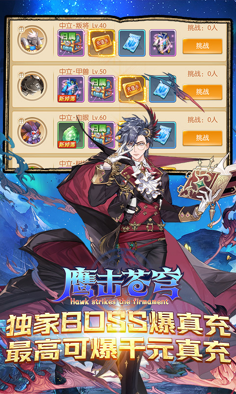 《鹰击苍穹(无限爆真充)》是一款以二次元魔幻色彩为题材的角色扮演类手机网络游戏。免费升VIP12,可同时拥有五个角色共同对战,有着超丰富的BOSS副本,跨服PK竞争,自由转职,与萌萌宠物并肩作战,展开一场刺激有趣的冒险旅程!